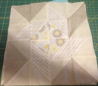 Colleen Fifield's Broken Wheel block. Willow mixed with Noteworthy. Love the soft yellows and grays.